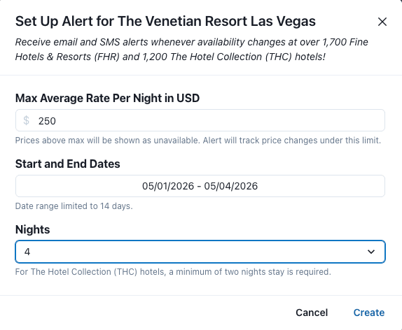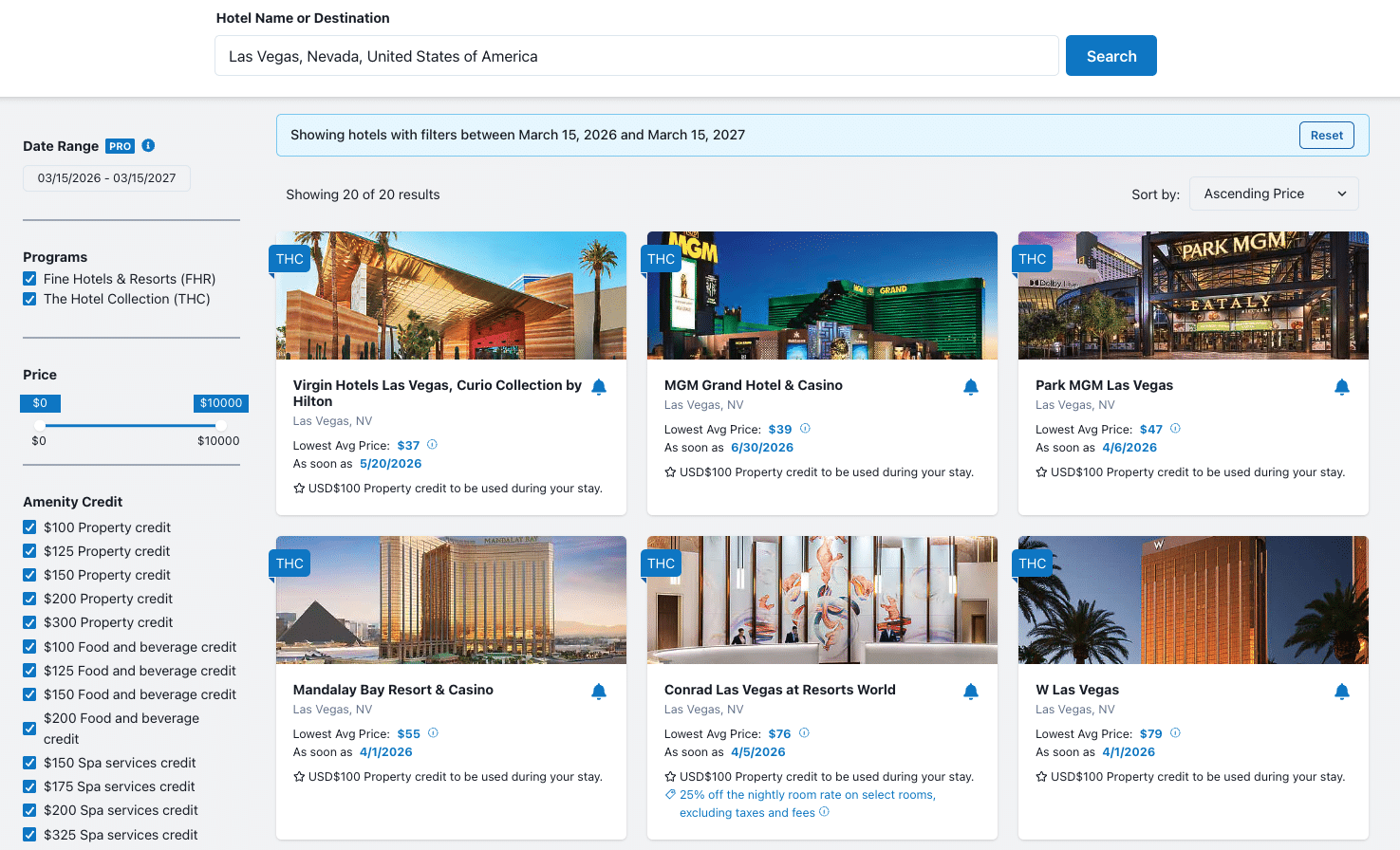 Price volatility exists even in the FHR program. A property might offer an FHR rate of $600 per night today and $450 in two weeks due to changes in demand forecasting or competitive dynamics. By setting alerts, you can wait for rates to reach your target price before committing.