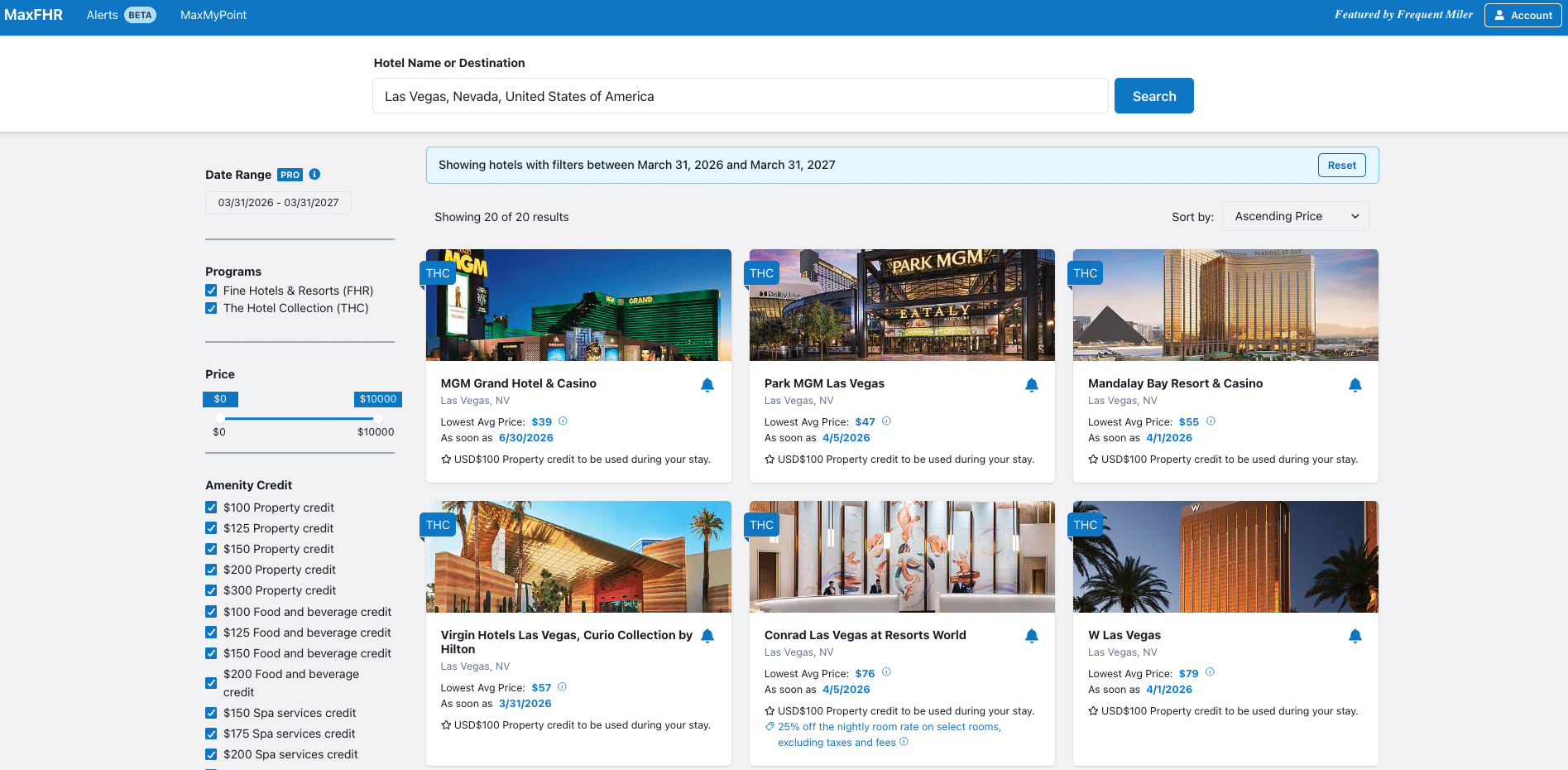 MaxFHR aggregates FHR rates and benefits across properties, allowing you to compare options efficiently rather than visiting each hotel’s listing individually on the Amex Travel portal. The platform tracks not just the nightly rate but also the total value package including all benefits.