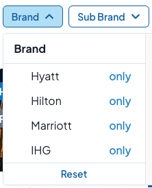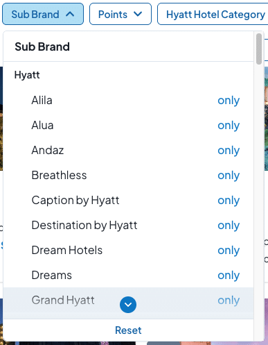 There are several filters available to fine tune your search results, including hotel brands such as Marriott Bonvoy, Hilton Honors, or World of Hyatt. You can also filter by sub-brands, which is helpful if you only want to see luxury properties like Park Hyatt or St. Regis, or if you want to exclude budget brands like Moxy or Tru by Hilton.