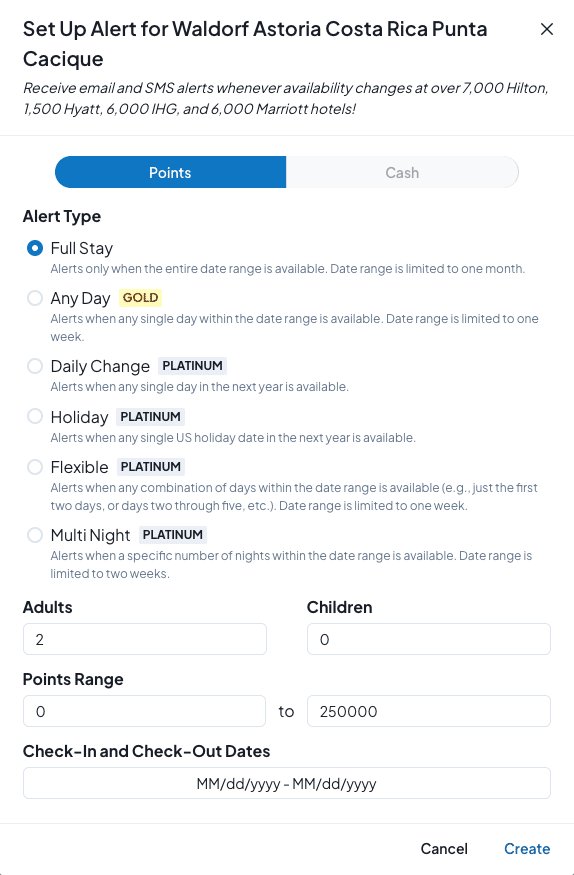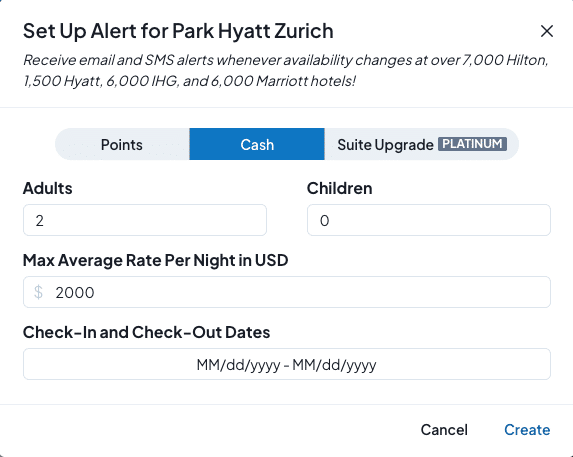For Marriott and Hyatt properties, you can also set cash price alerts. This feature monitors the paid rate and notifies you if prices drop below your target. Combined with flexible cancellation policies, this allows you to book now and rebook later if prices improve, a strategy that can save hundreds of dollars on longer stays.