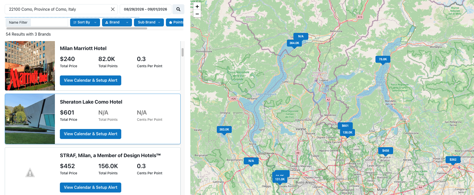 The beta Map feature adds a geographic dimension to your hotel search. Instead of searching for specific properties, you can explore what’s available in a region, still with the ability to filter by brand and sort by value metrics. This map view creates a very similar interface to the hotel award search tool: Awayz.