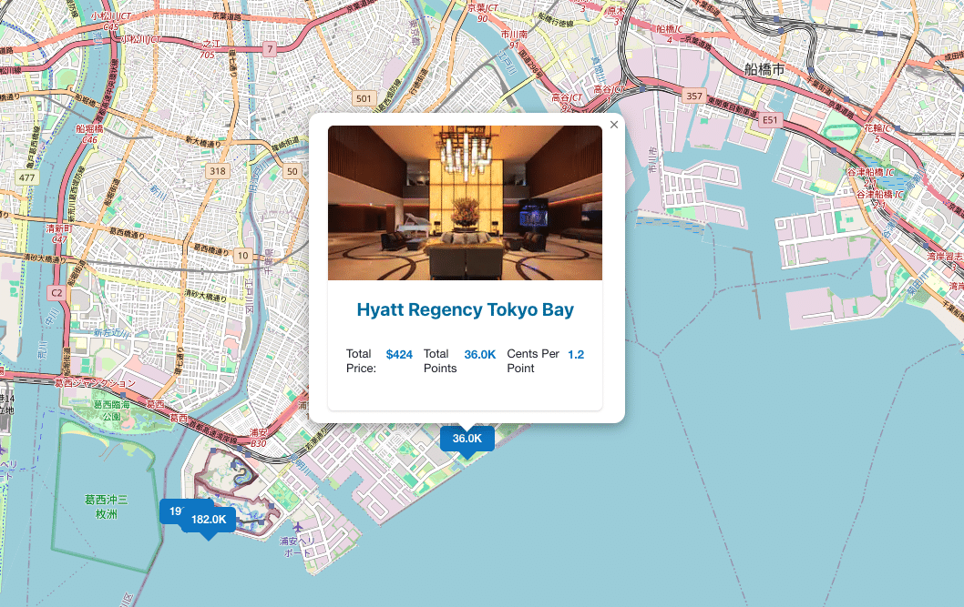 Suppose you’re planning a trip to Tokyo and want to stay near Disneyland. The map reveals three hotels: the Hyatt Regency Tokyo Bay, Hilton Tokyo Bay, and Sheraton Grande Tokyo Bay Hotel. At a glance, you can see that while the Hyatt offers the best redemption value per point, the Hilton and Sheraton are significantly closer to the park entrance, which might justify their slightly lower value given the time and transportation costs saved.