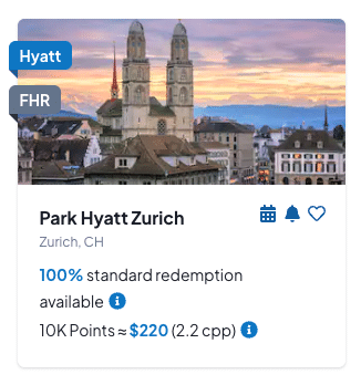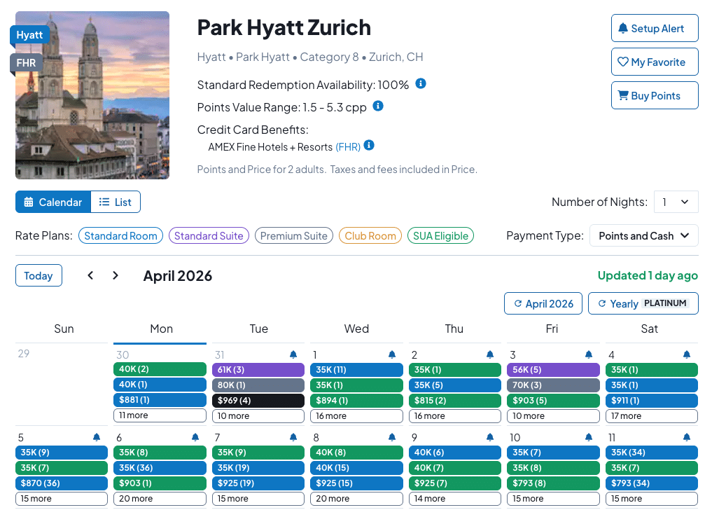 Unlike traditional hotel search engines that only show cash rates, MaxMyPoint and MaxFHR are purpose-built for sophisticated travelers who understand the value of loyalty programs and premium booking platforms. MaxMyPoint displays both cash and award pricing side-by-side, making it easy to calculate the cents-per-point value of redemptions. The platform also tracks award availability over time, which is crucial for properties that play games with their award calendars (ahem… looking at you Hyatt).