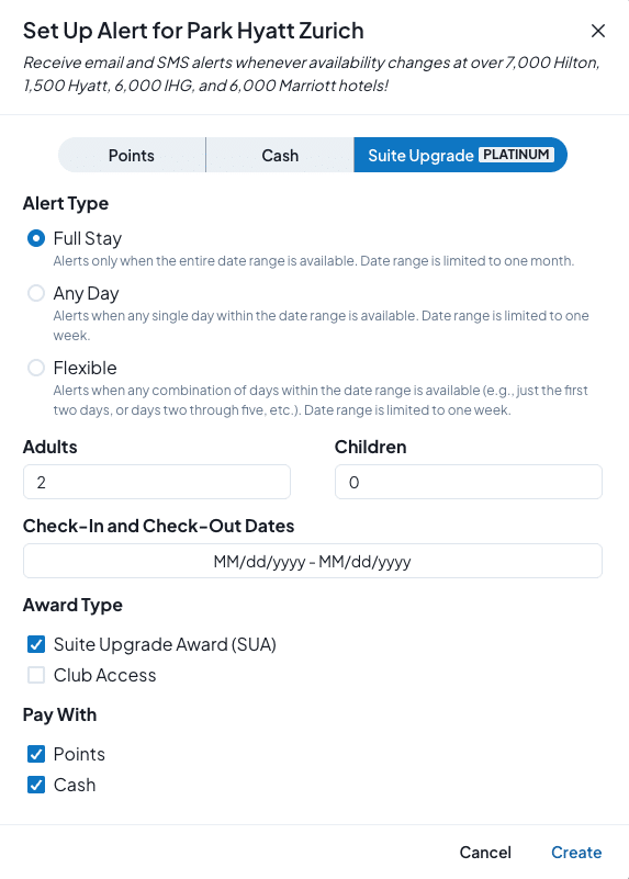 As a Platinum subscriber, you can also set Suite Upgrade alerts for World of Hyatt properties. If you’re a Globalist member sitting on suite upgrade awards (SUAs), MaxMyPoint can notify you when suite award availability opens at your target property. Since suite availability is often even more restricted than standard room awards, these alerts are particularly valuable for high-demand properties where suites disappear quickly. This takes much of the manual legwork out of burning those hard-earned upgrade certificates before they expire.