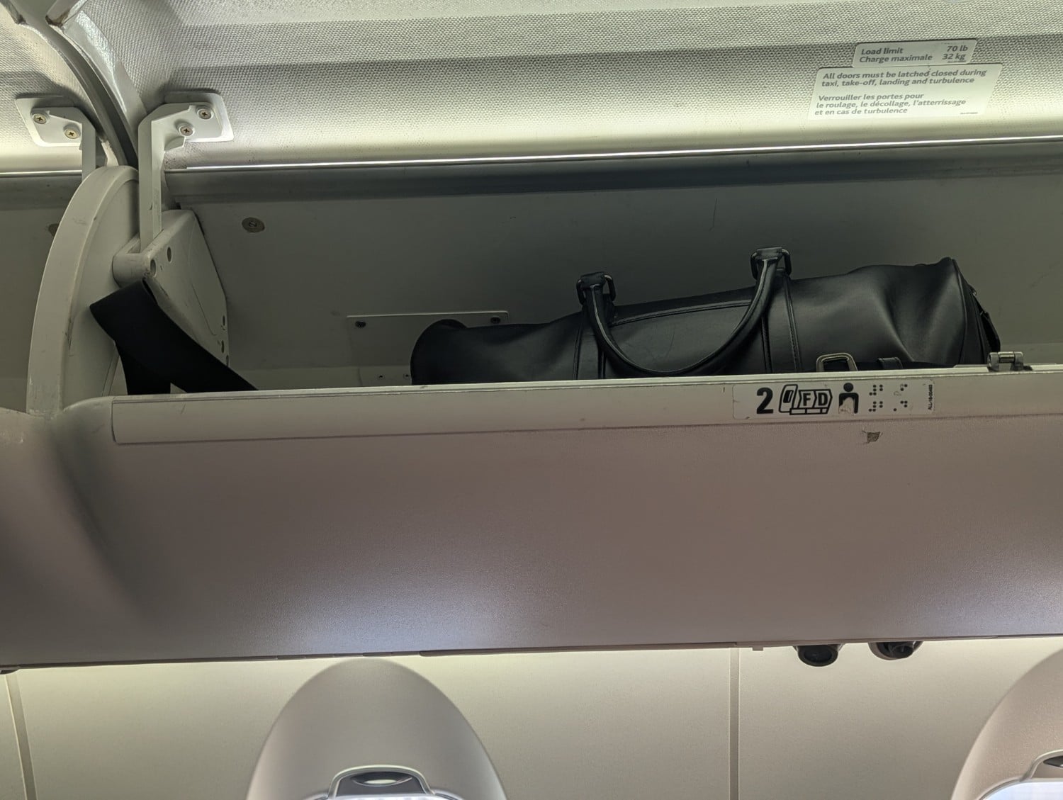 Overhead in the 1-2 layout, there are small cubbies all along the port side of the aircraft. These aren’t really big enough to put anything bigger than a purse or a duty-free shopping bag into. I had to put my carry-on duffel on the other side, in the overhead bin above seats 1D and 1F. Fortunately, the flight was half-empty, so this wasn’t a problem.