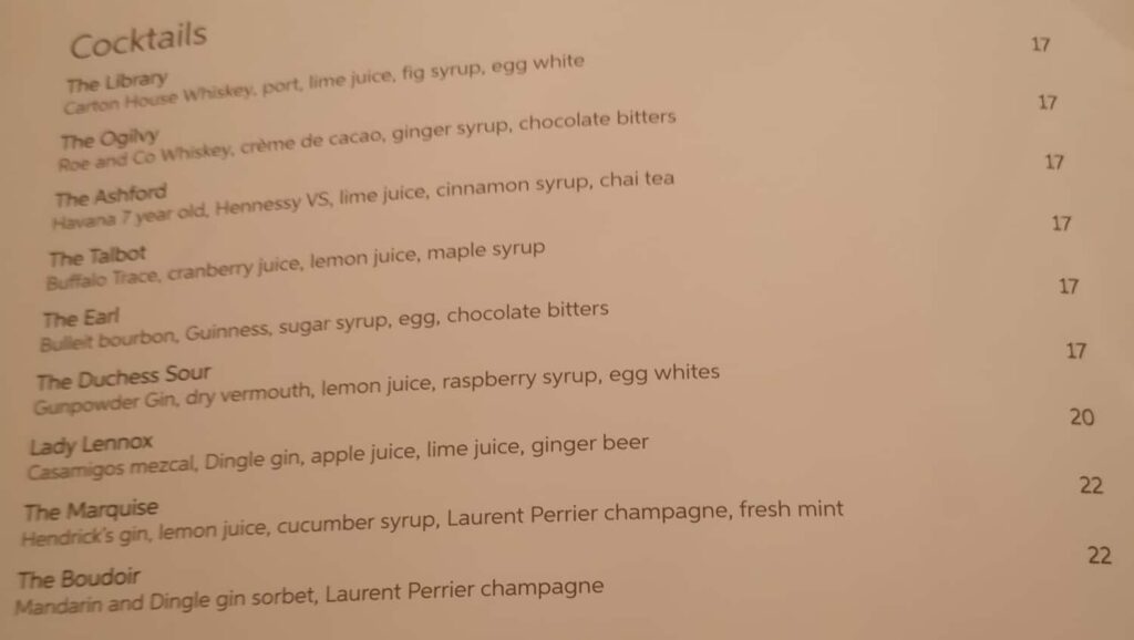 A little note – be careful with Fairmont/Accor drink vouchers. They can be a bit hit or miss as to what they’ll cover. I’ve had my last few Fairmonts provide vouchers which were good for any cocktail or drink. Meanwhile at Carton House they were only good for basic beer, wine, or non-alcoholic beverages.
