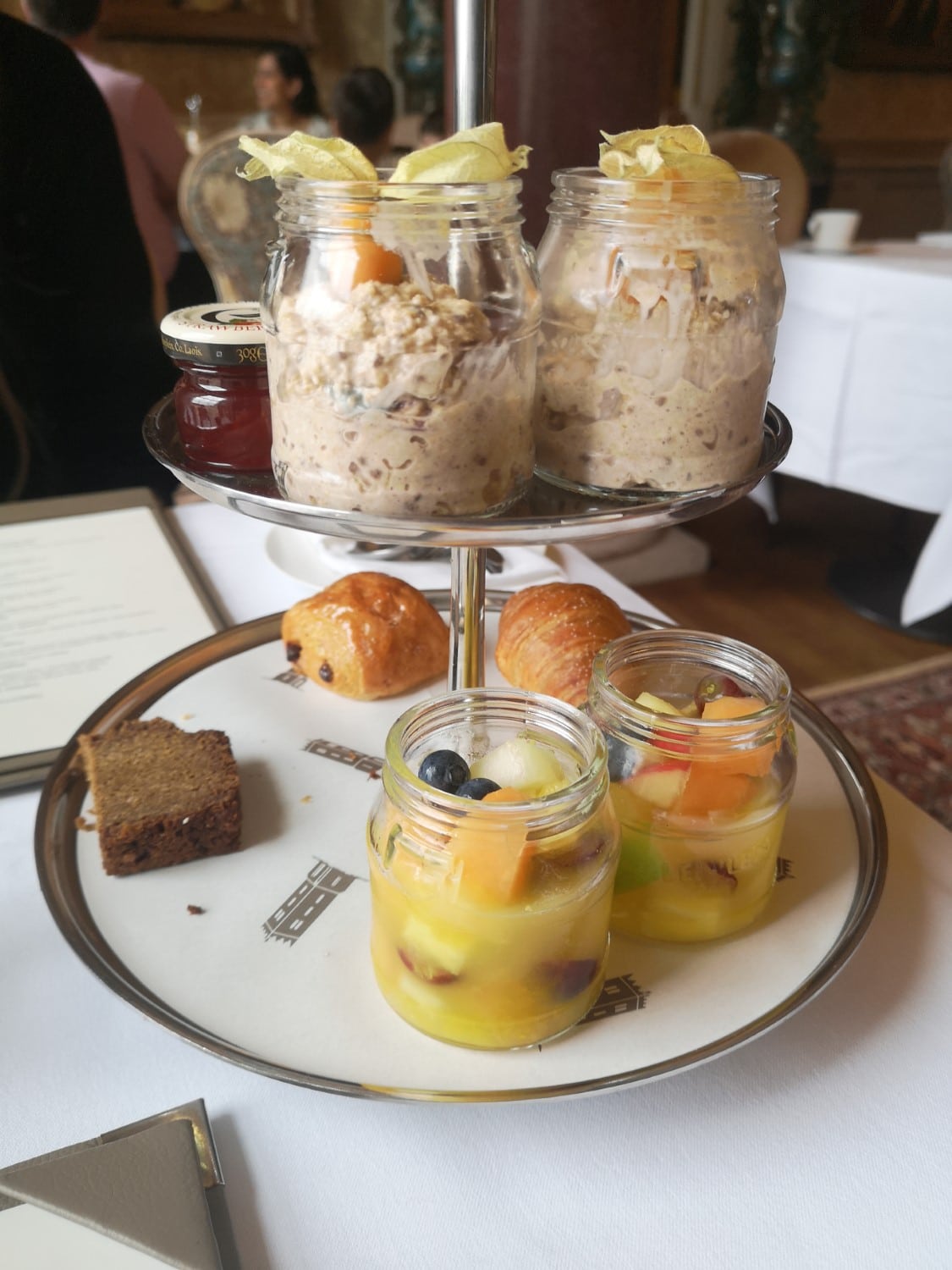 We started breakfast off with a juice shot. Then a cart of cold foods was delivered to our table, including porridge, yogurt, breads and croissants, and fruit.