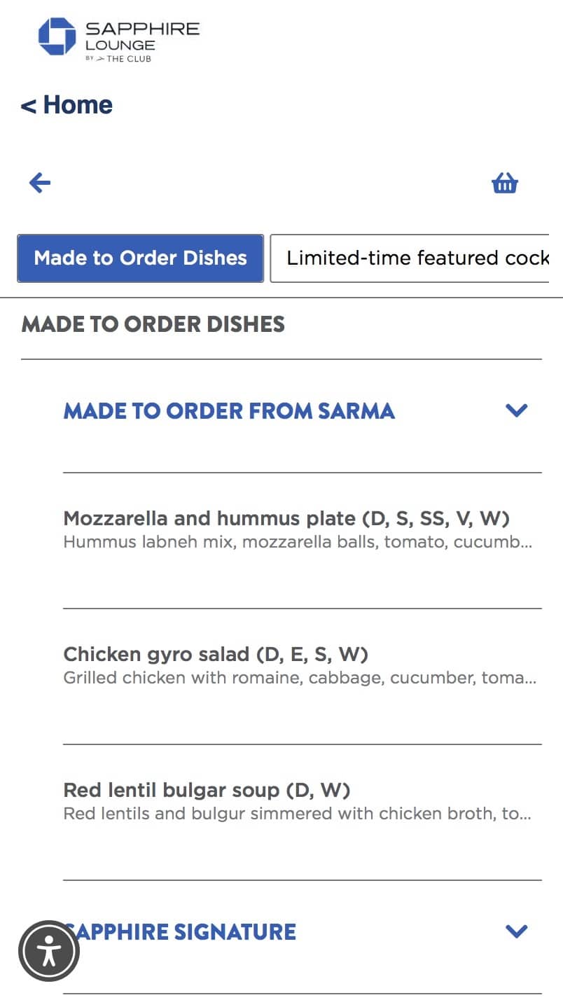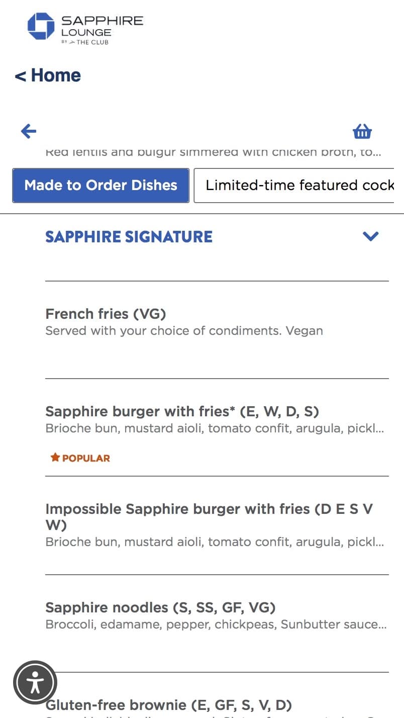 There aren’t many dine-on-demand options, but they’ve got a rotating menu from Sarma, a well-known Mediterranean restaurant in Boston. There are also Sapphire Lounge staples in the Sapphire Signature portion. Once you’ve made your selections, you’ll get a confirmation screen and the option to order more.