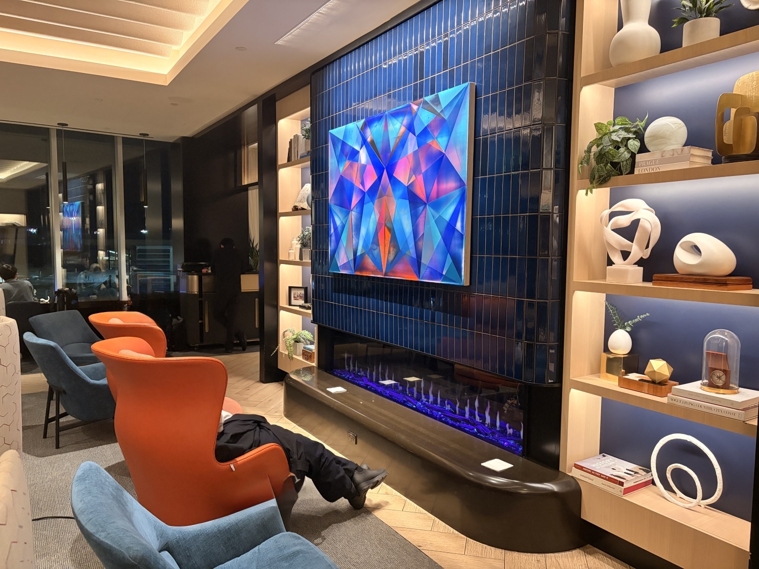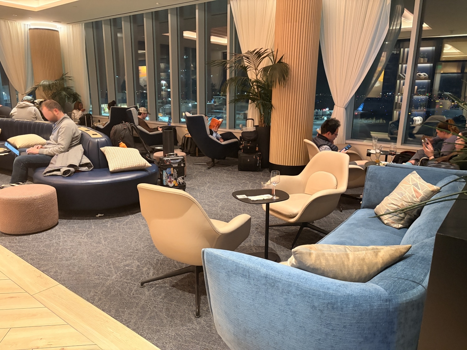 Tucked away in the back of the lounge next to a beverage station is this grand fireplace display with some comfy chairs. Around the corner from this, you’ll find an open seating area with apron views, which, during the daytime, provides some great plane spotting. This is a significant upgrade over the Sapphire Lounge at New York LaGuardia, which doesn’t even have windows.