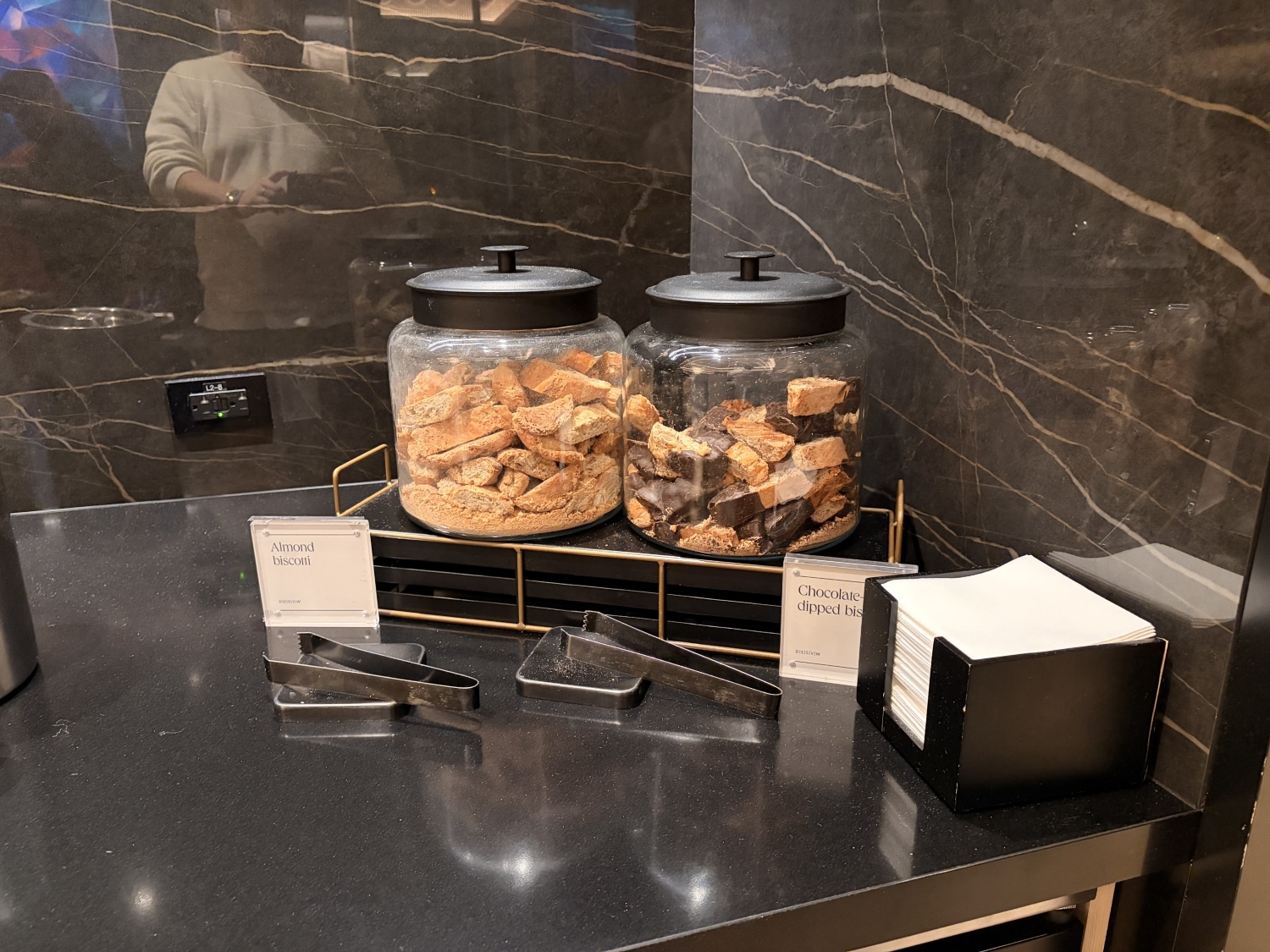 There are two beverage and snack stations in the lounge where you’ll find canned drinks, coffee from a local Boston roaster, Atomic (including cold brew on tap), tea, and some light bites.