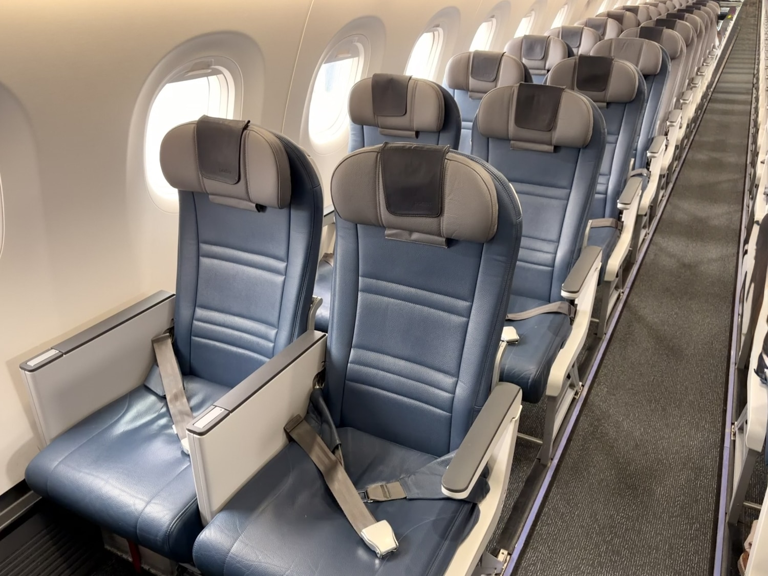 There are 16 PorterReserve seats available, arranged in a 2-2 layout over the first four rows. PorterReserve seats offer substantially more legroom, but I’ve also found Porter’s exit row seats to be more than satisfactory.