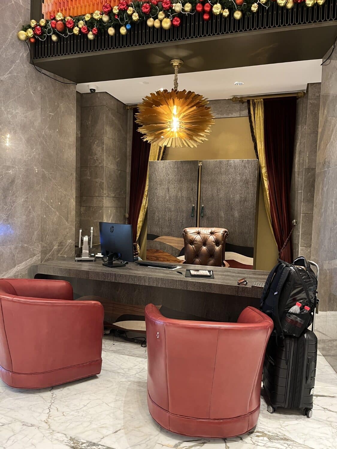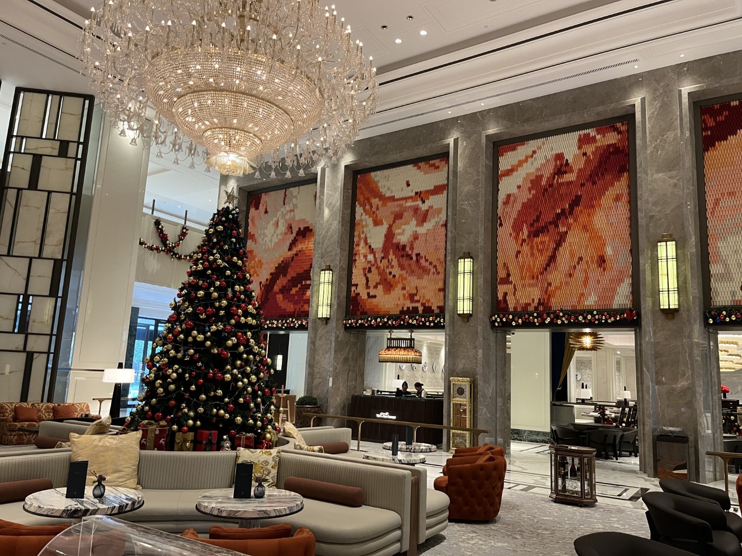 Arriving in the lobby, you are met with a stunning view of a huge chandelier and then ushered to a private check-in area.