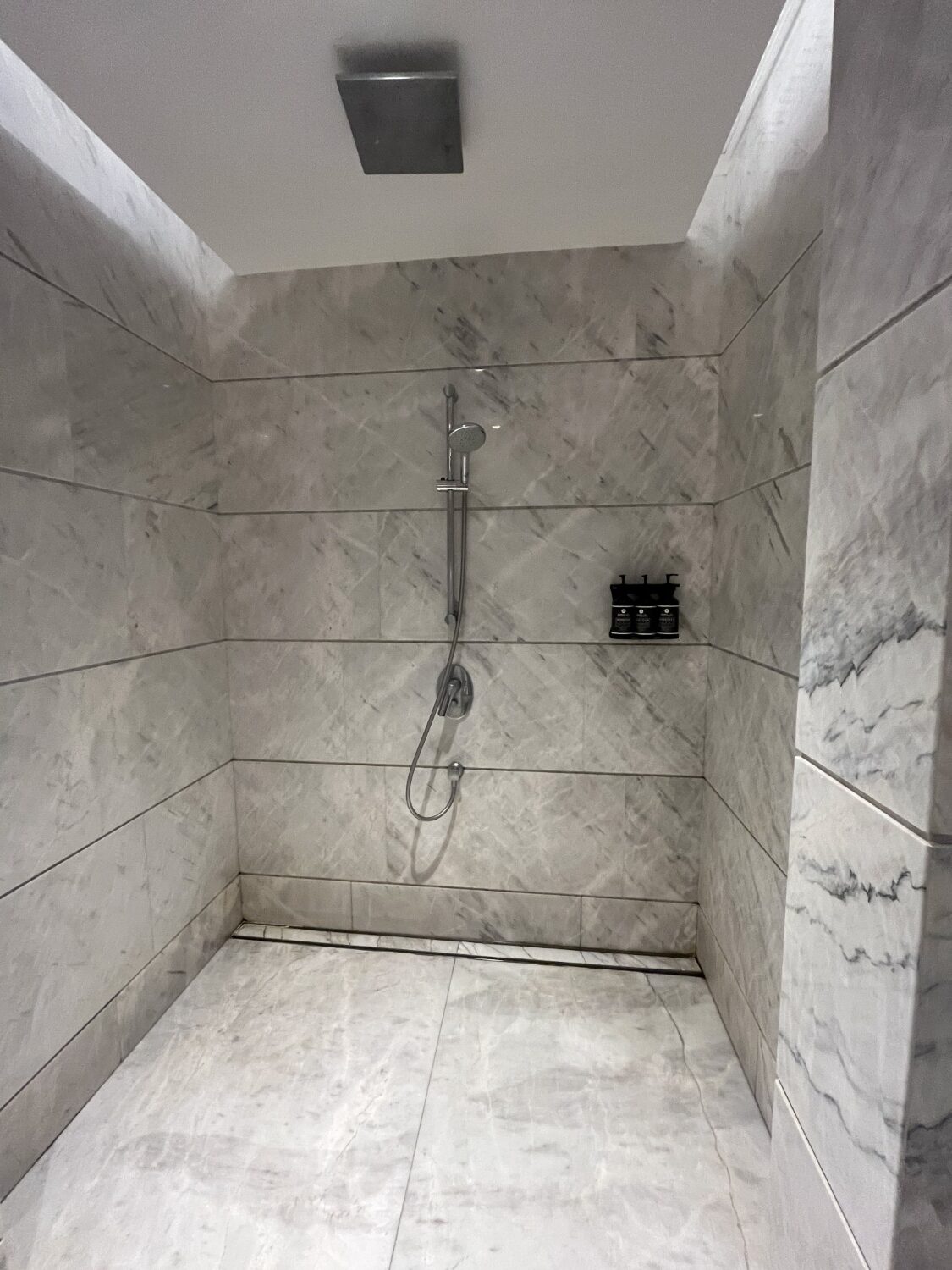 The shower and toilet chamber are lavishly decked out in marble from top to bottom, and the shower is huge.