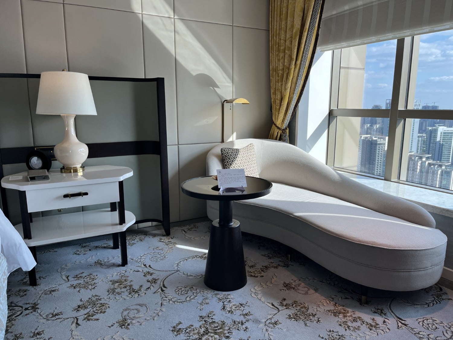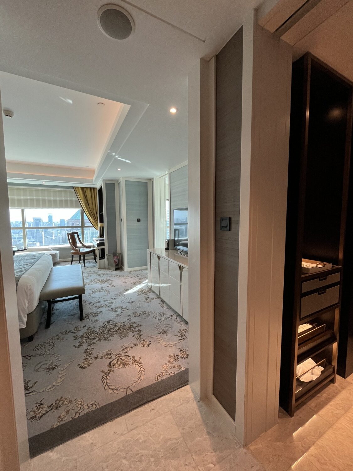 Walking into the bedroom area, you’re greeted with sweeping views of Shanghai and an extremely plush carpet. The accent lighting is also beautiful in the room, with warm ambient lights adding a touch of comfort to something usually boring, like a ceiling.