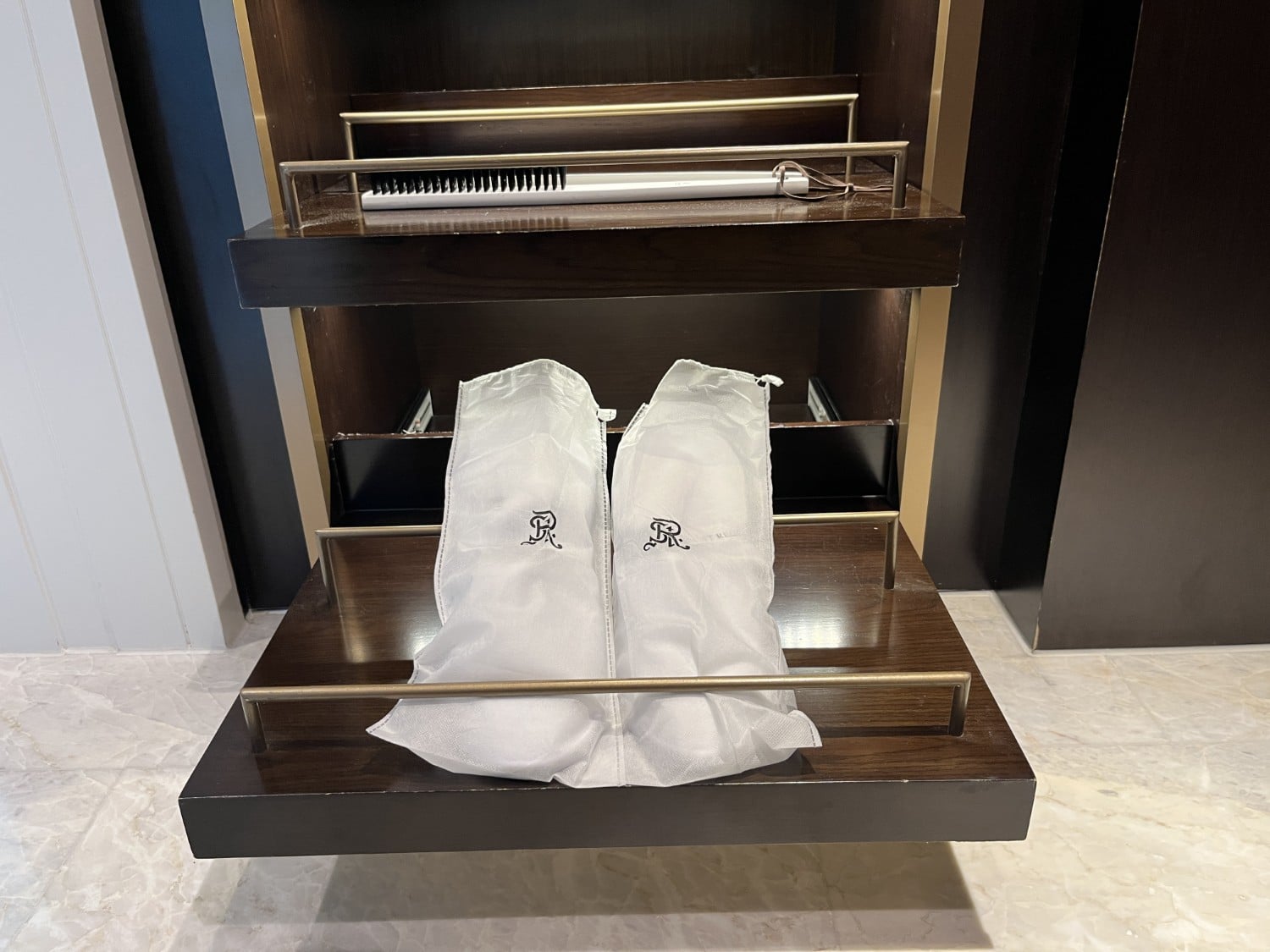 Upon entering, you’ll find a spacious walk-in closet immediately to your right, complete with a robe, St. Regis slippers, a safe, shoeshine, and laundry bags.