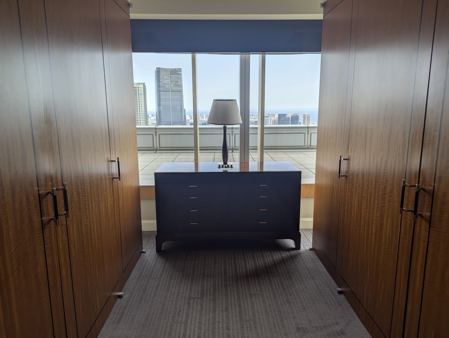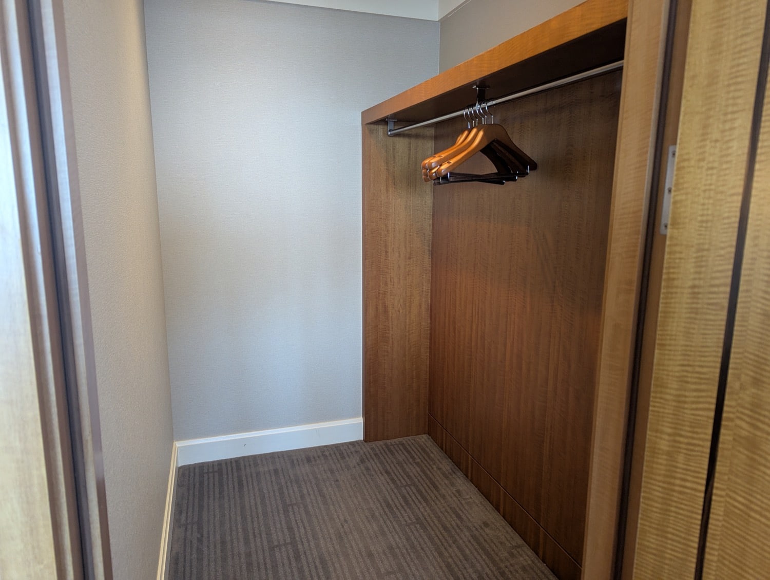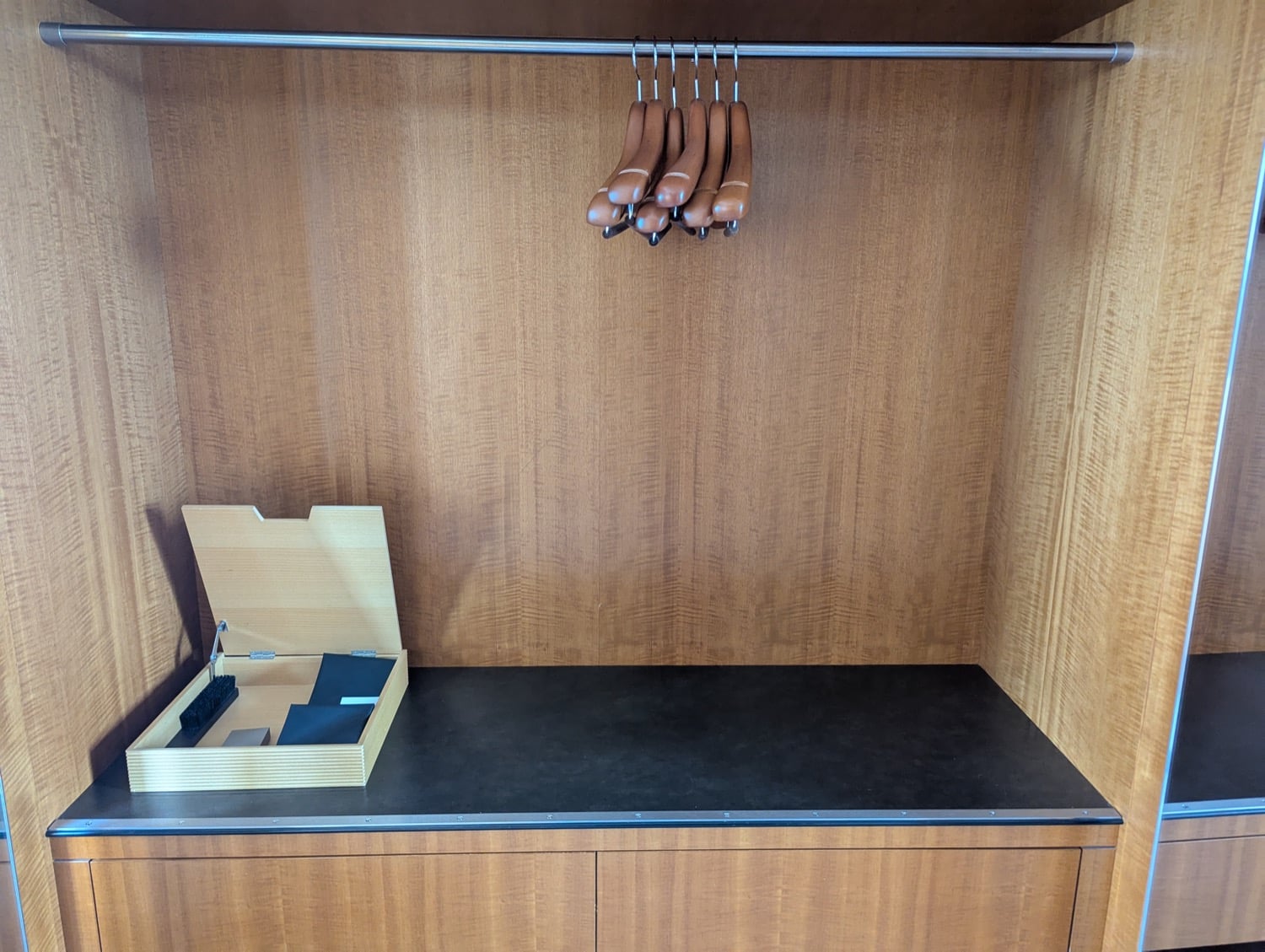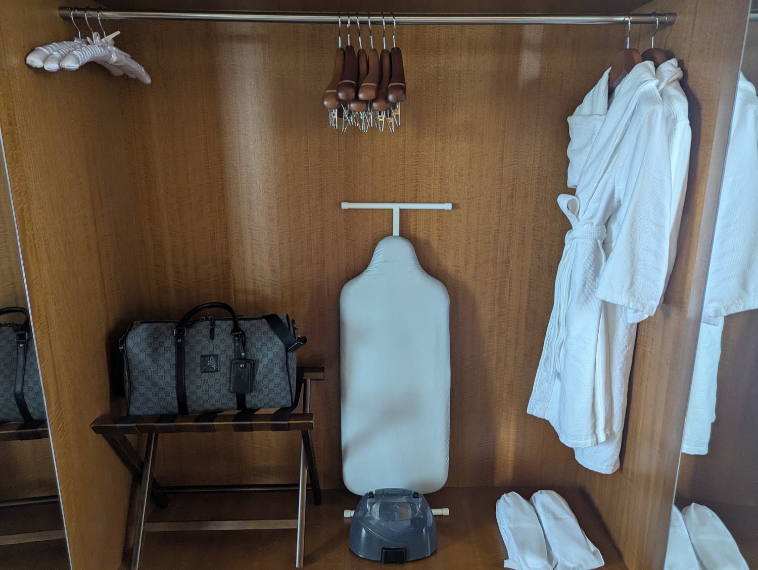 The closet area offers ample room for a couple of suitcases and plenty of hanging space for clothes. The room includes thoughtful amenities such as an iron and clothing steamer, two robes, a pair of slippers, and shoe care accessories.