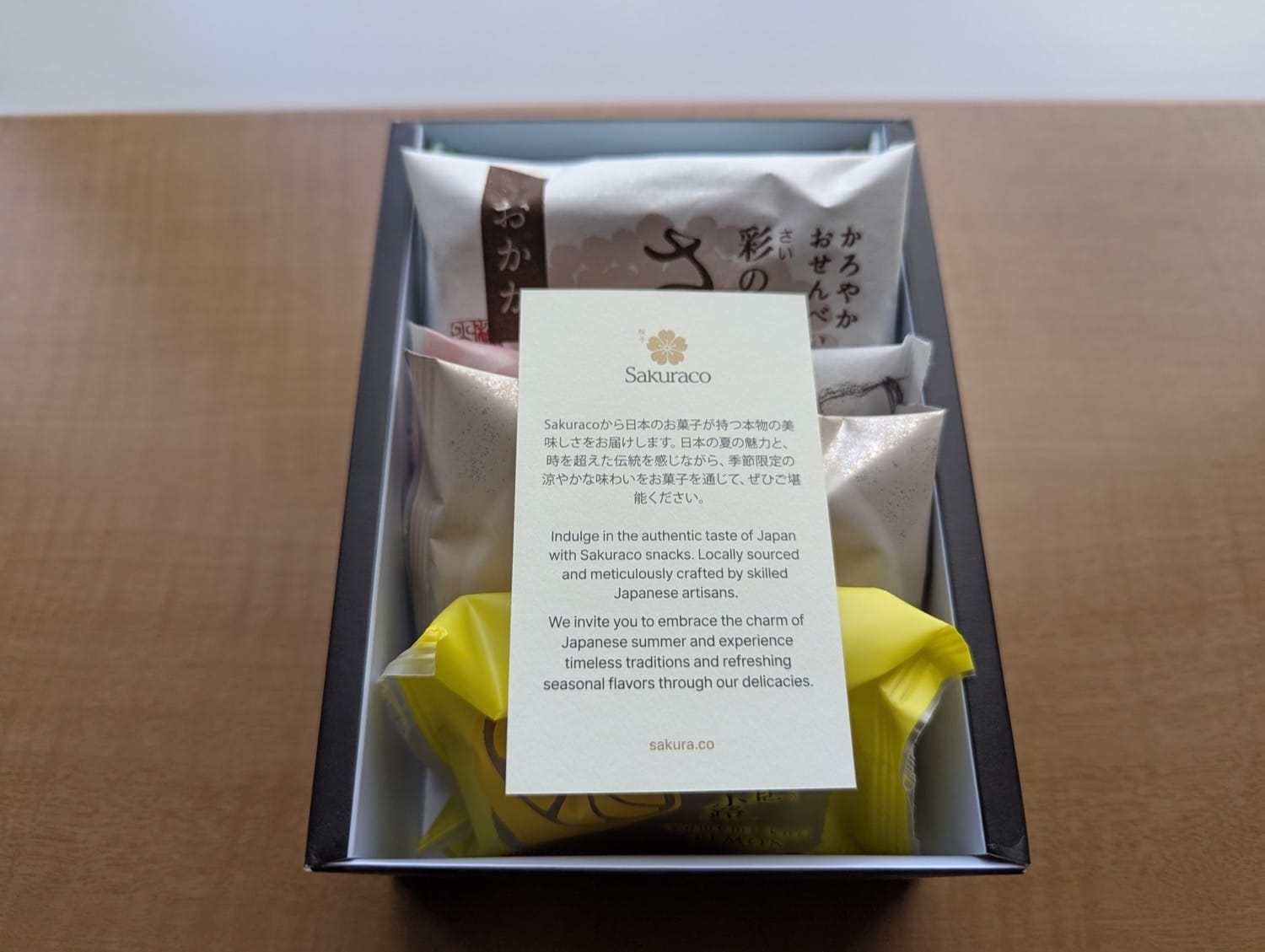 A welcome amenity of a box of Japanese snacks was placed on the coffee table before my arrival.