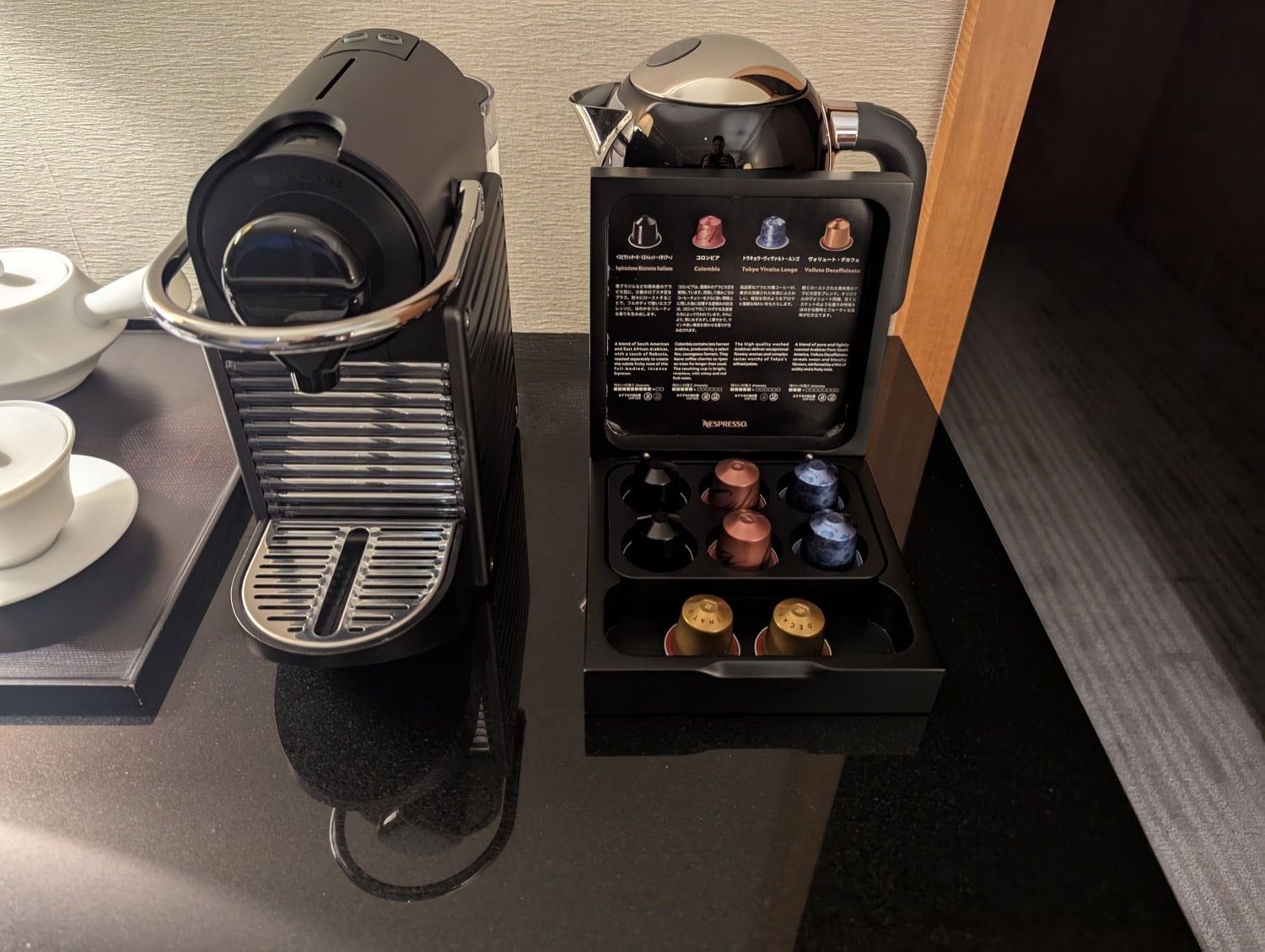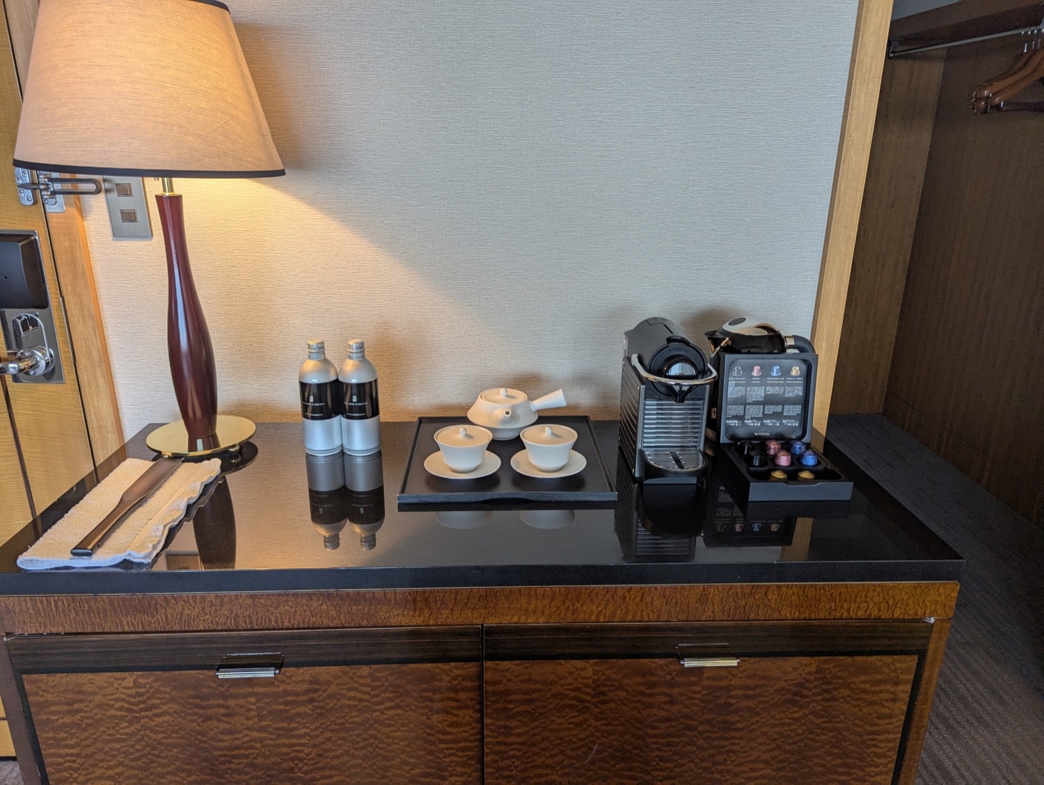 Immediately to the left of the entry door was the minibar cabinet, stocked with bottled water, a Nespresso machine, and a selection of complimentary Nespresso pods. Inside the cabinet was some glassware and a mini fridge filled with soda, juice, beer, and wine.