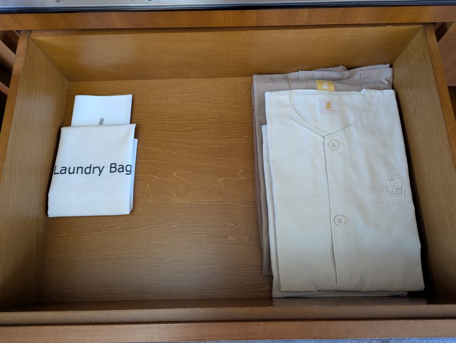 In one of the drawers is a couple of sets of pajamas embroidered with the Ritz-Carlton logo.