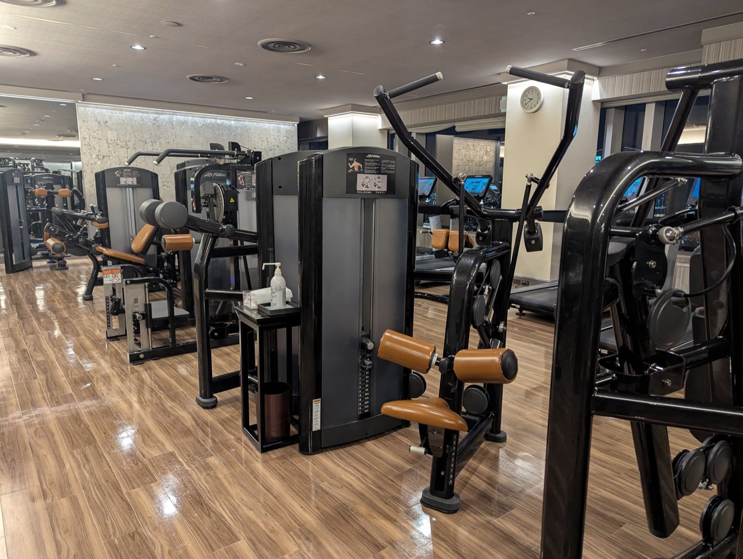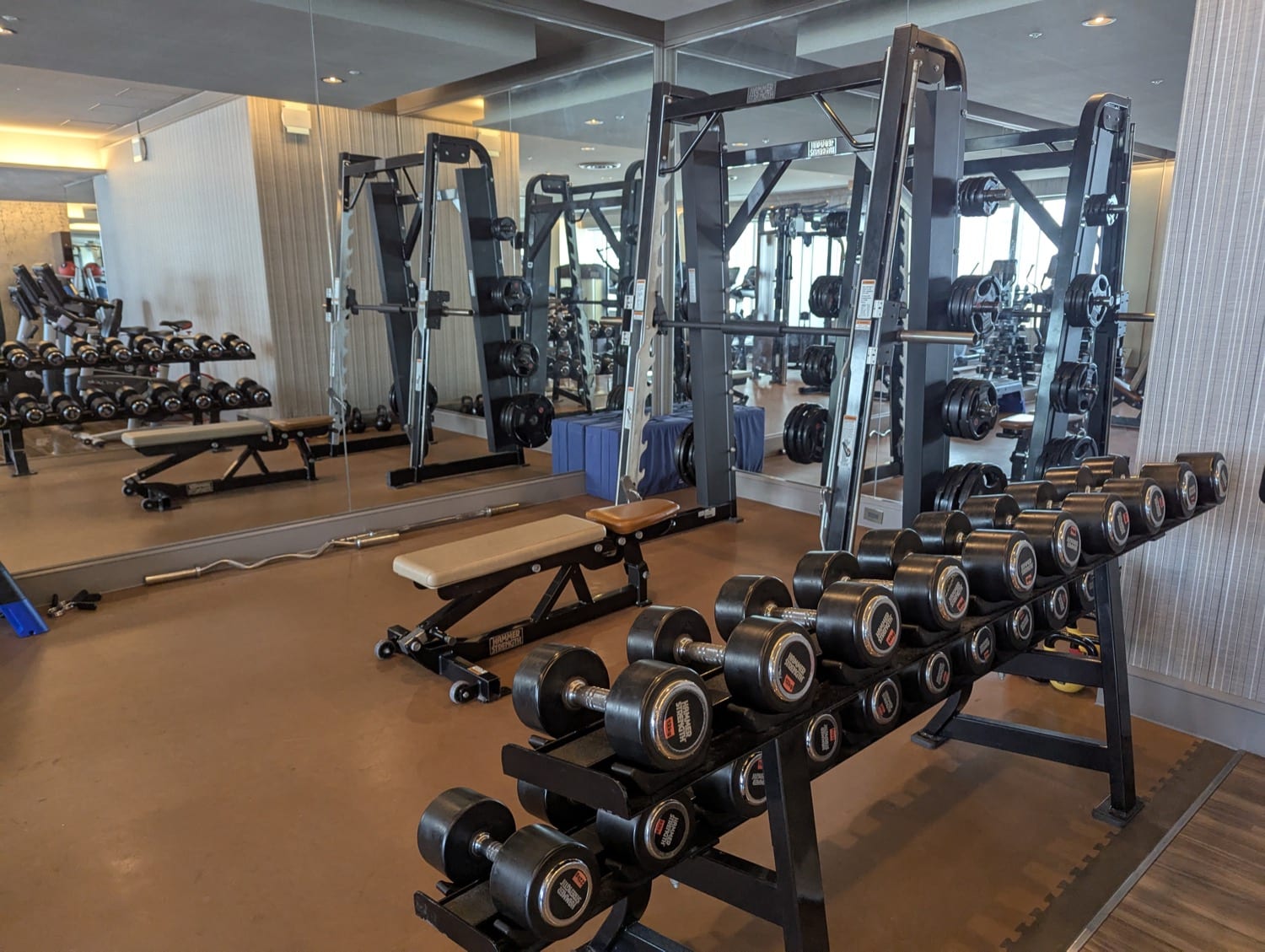 The fitness center is outfitted with nearly every piece of equipment needed for a solid workout. It features about a dozen strength machines, including shoulder presses, chest presses, leg curls, pulldowns, and more. A well-designed free weight area rounds things out, with several benches and a Smith machine.