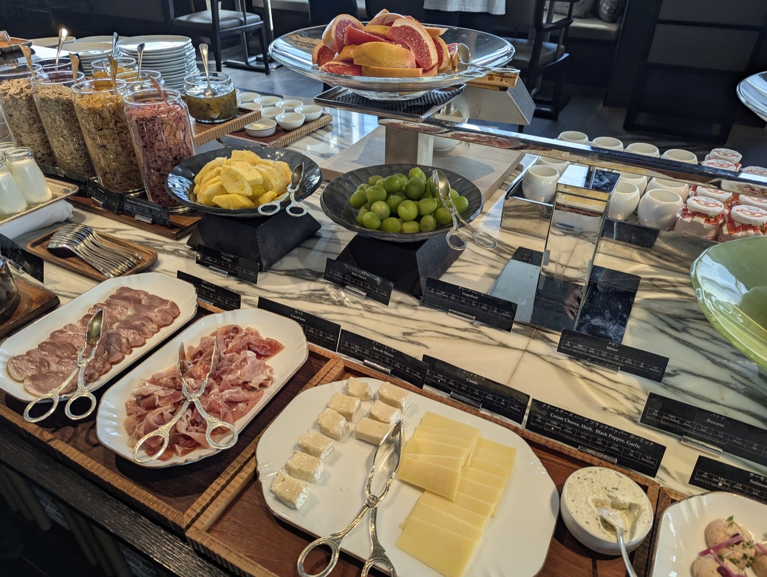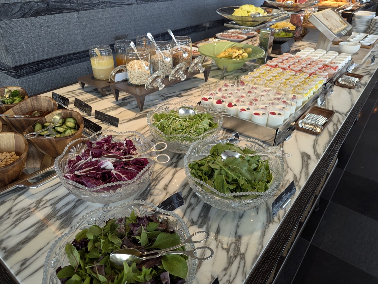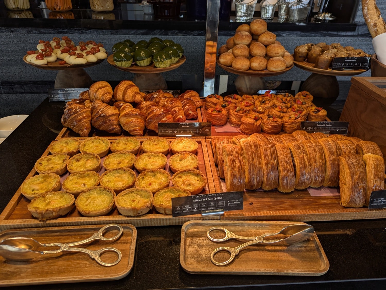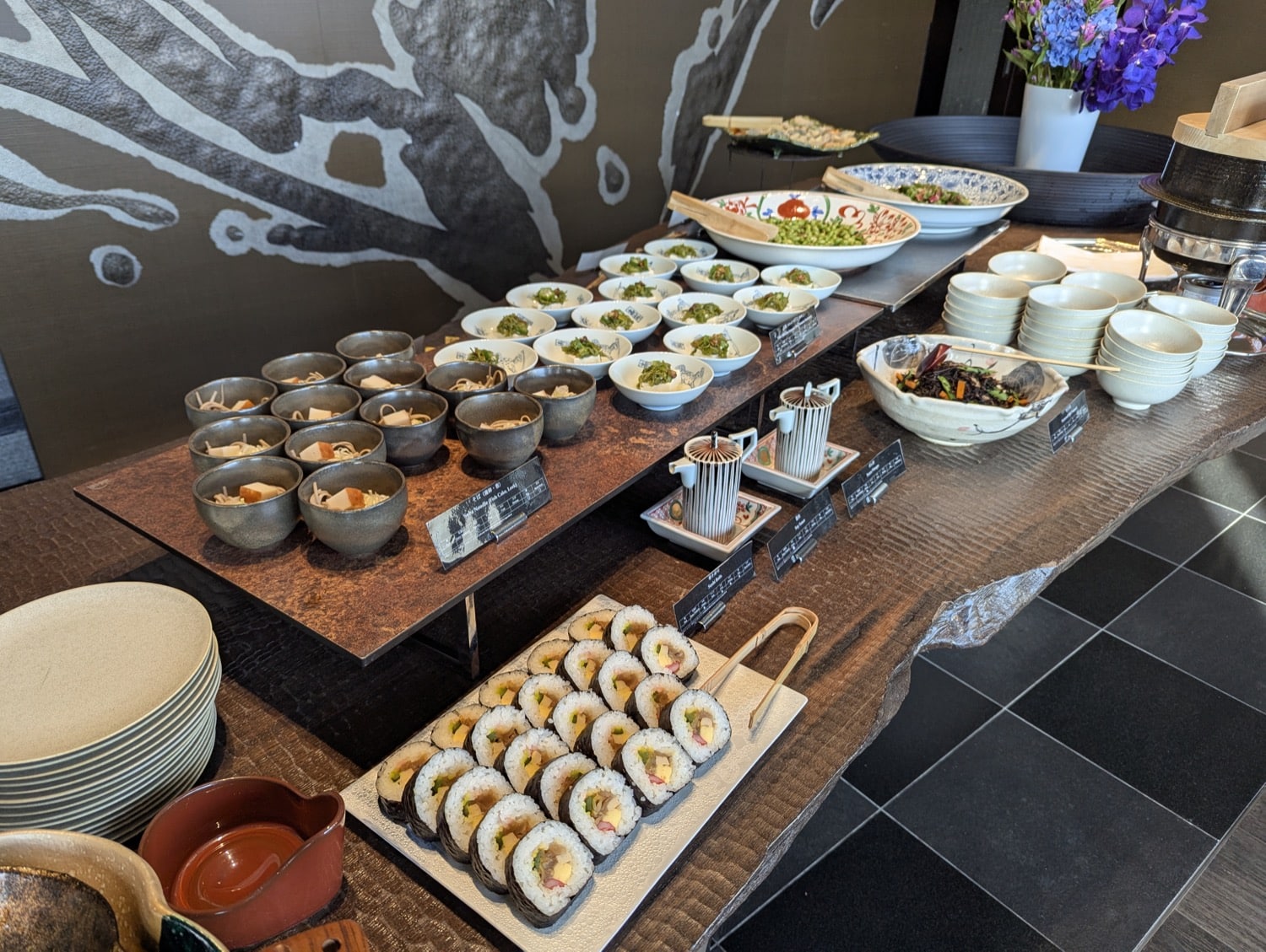 The buffet offers a solid mix of Western and Japanese cuisine, with all the usual staples like pastries, fruit, yogurt, meats, cheeses, and salads, plus a good variety of Japanese dishes including noodles, sushi rolls, and tofu options.