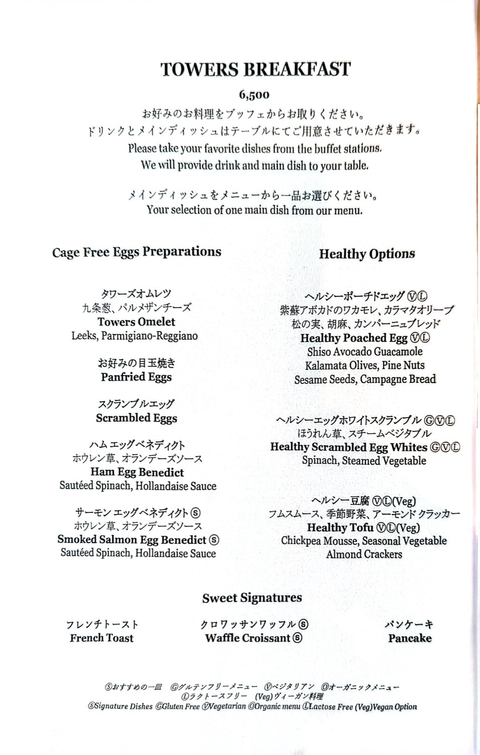 Breakfast is served each morning in Towers Restaurant from 7:00 AM to 10:30 AM. I was pleased that I would be able to enjoy a complimentary Ritz-Carlton breakfast thanks to my Titanium status. Remember that this perk applies only to Titanium Elite members and above, as the usual Platinum status doesn’t qualify. The cost for those who do not have breakfast included in their stay is ¥6,500 (CA$57) per person.
