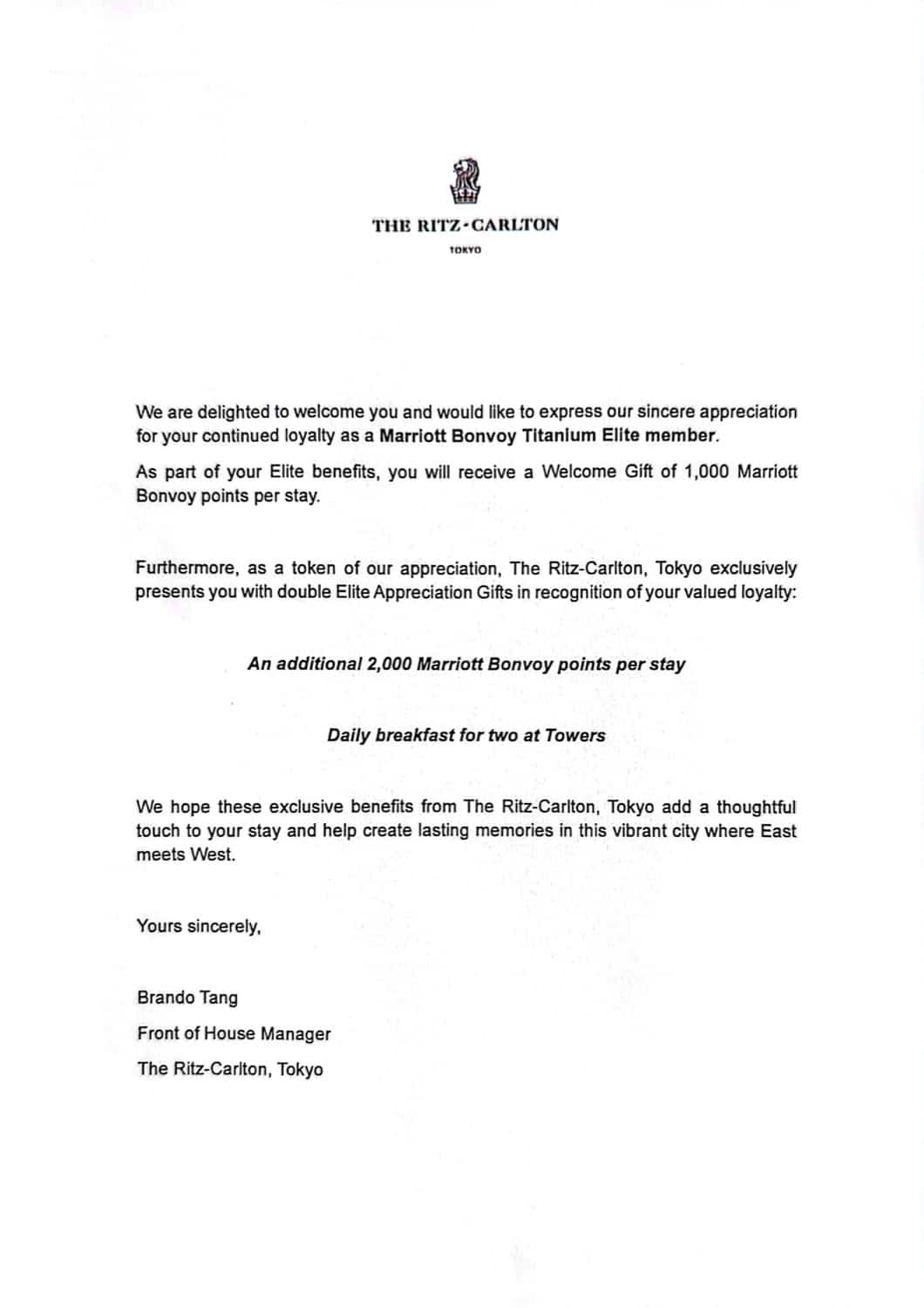 I tend to avoid Ritz-Carlton properties, as the brand is notoriously stingy when it comes to recognizing elite benefits. Room upgrades are often limited, and elite members typically don’t receive complimentary breakfast or lounge access. However, I was pleasantly surprised when the front desk agent informed me that, as a Titanium Elite member, I would receive a complimentary breakfast and an additional 2,000 Bonvoy points as an appreciation for my loyalty. This is highly unusual for the brand, and The Ritz-Carlton Tokyo is one of the very few Ritz-Carlton properties that extend these benefits to elite members.