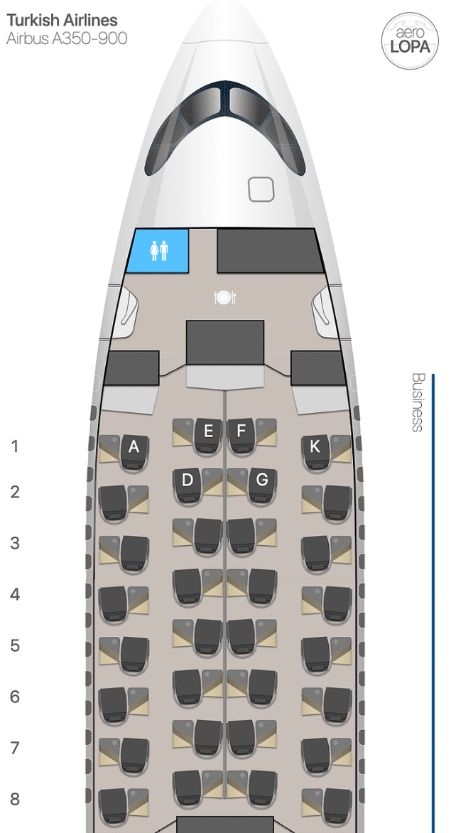 Turkish Airlines have configured its Airbus A350 business class cabin in a staggered 1–2–1 layout, with each row alternating between seats positioned closer to or further from the aisle.