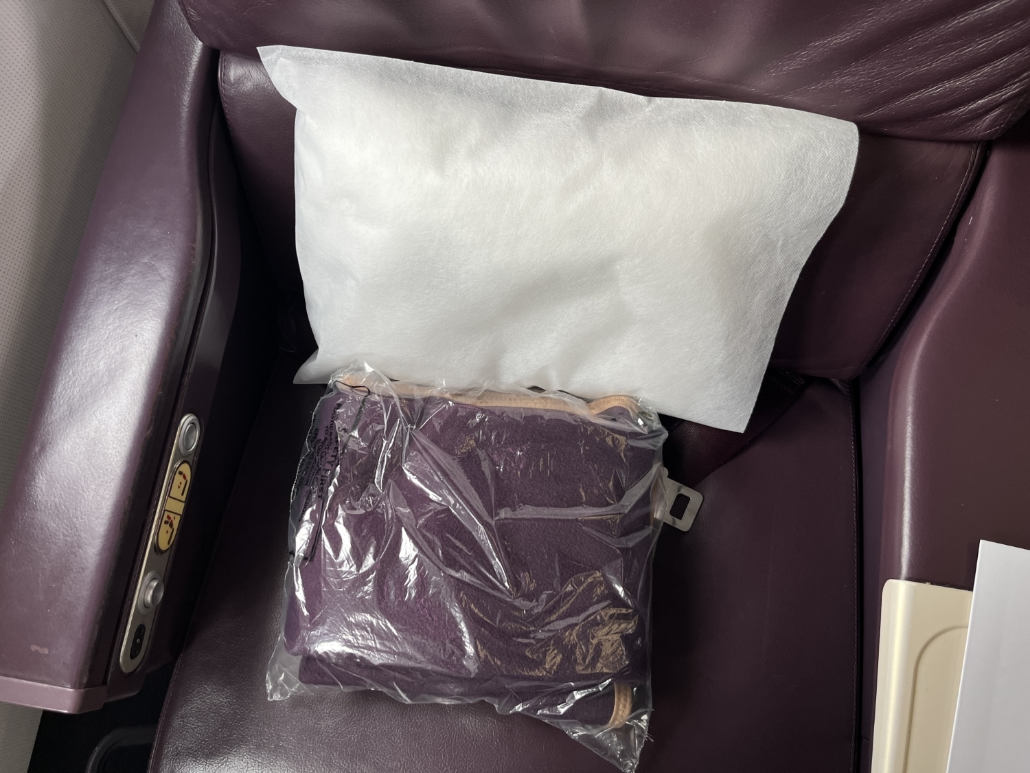 Waiting for me at my seat was a pillow, blanket, headphones, and a menu. The pillow and blanket were typical economy quality, nothing elevated for premium economy. On a daytime flight, as the westbound flights always are, I think that’s alright.