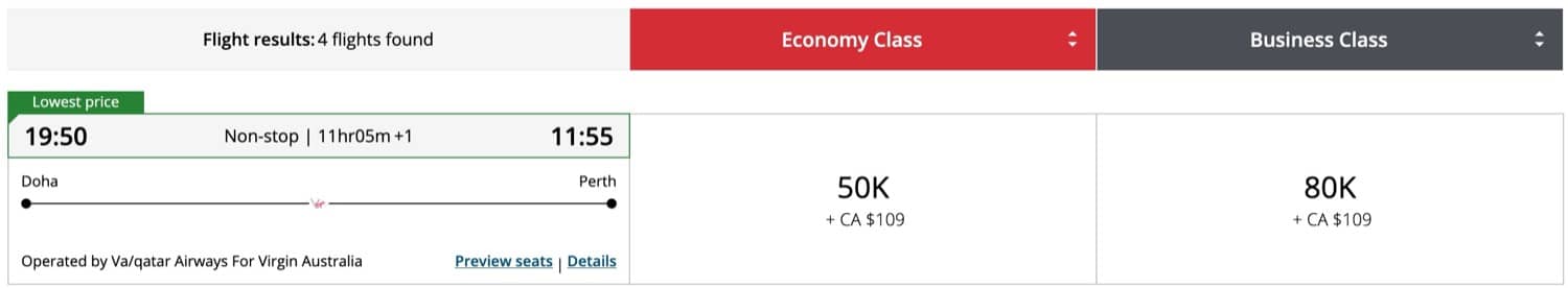 Award availability on these routes is also very good, with many dates open throughout the year. Flights are priced at 80,000 Aeroplan points for the Perth (PER) – Doha (DOH) route, while Sydney (SYD), Brisbane (BNE), and Melbourne (MEL) routes are priced at 110,000 points.