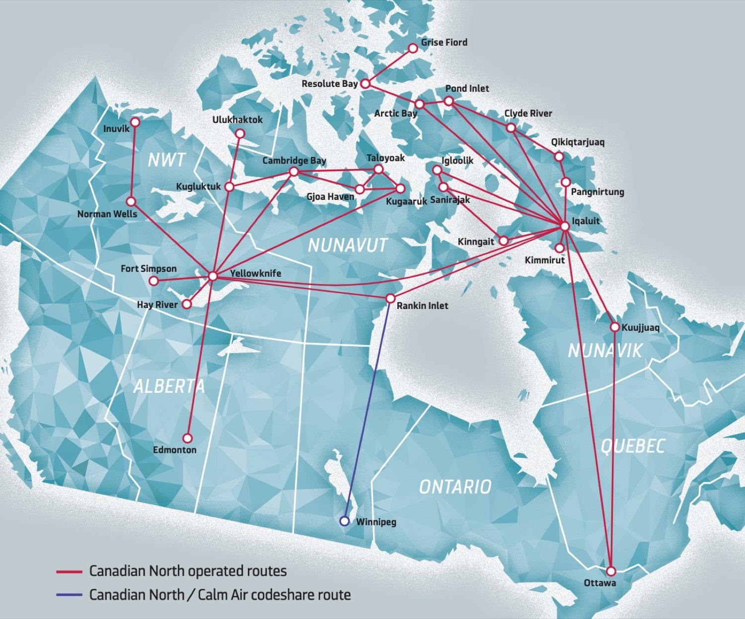 Typically, these airlines link major hubs such as Edmonton (YEG), Winnipeg (YWG), Toronto (YYZ), Ottawa (YOW), and Montreal (YUL) with communities in the Northwest Territories, Nunavut, and remote areas throughout Newfoundland and Labrador.