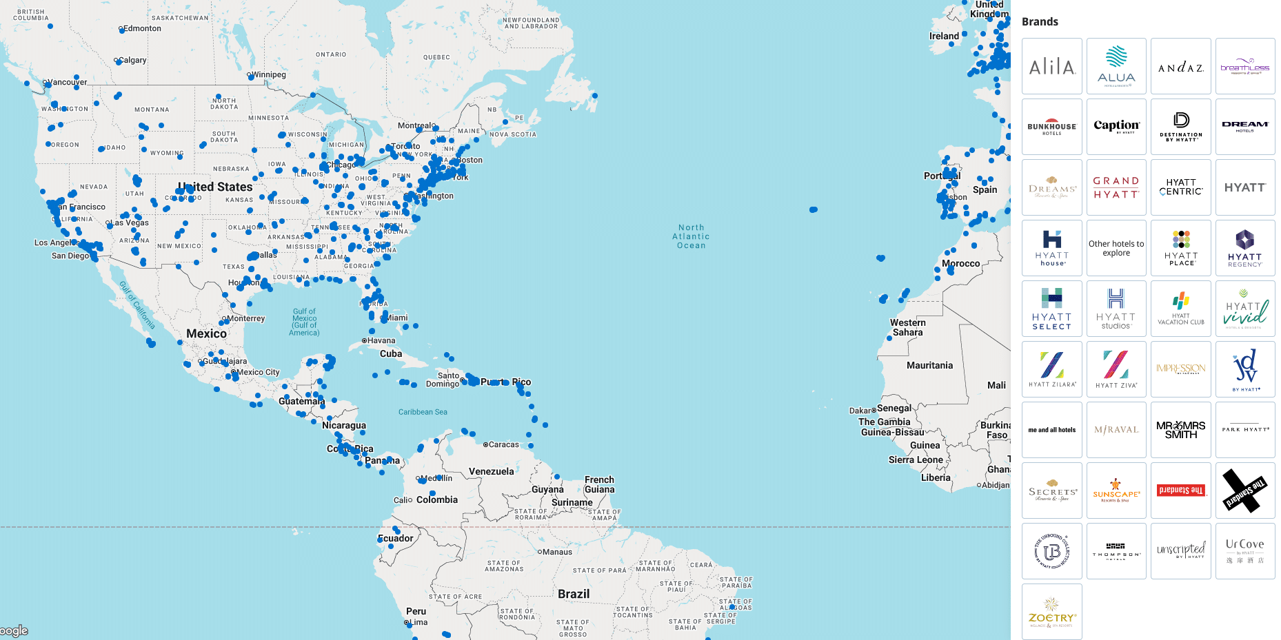 Using the map tool on the Hyatt website lets you filter by brand, making it easy to pinpoint the locations for each brand.